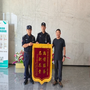 你用心地服务 我真诚地感谢 昨日,业主王先生送来一面锦旗,还送来了牛奶、水果等慰问品,真诚地感谢夜班保安员刘松波同志的用心服务。 保安员的根本宗旨,就是全心全意